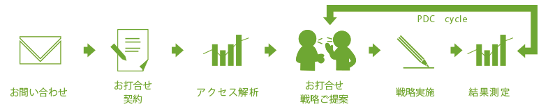 現状の把握、解析を行い、その後は戦略の提案→実施→結果を判断。